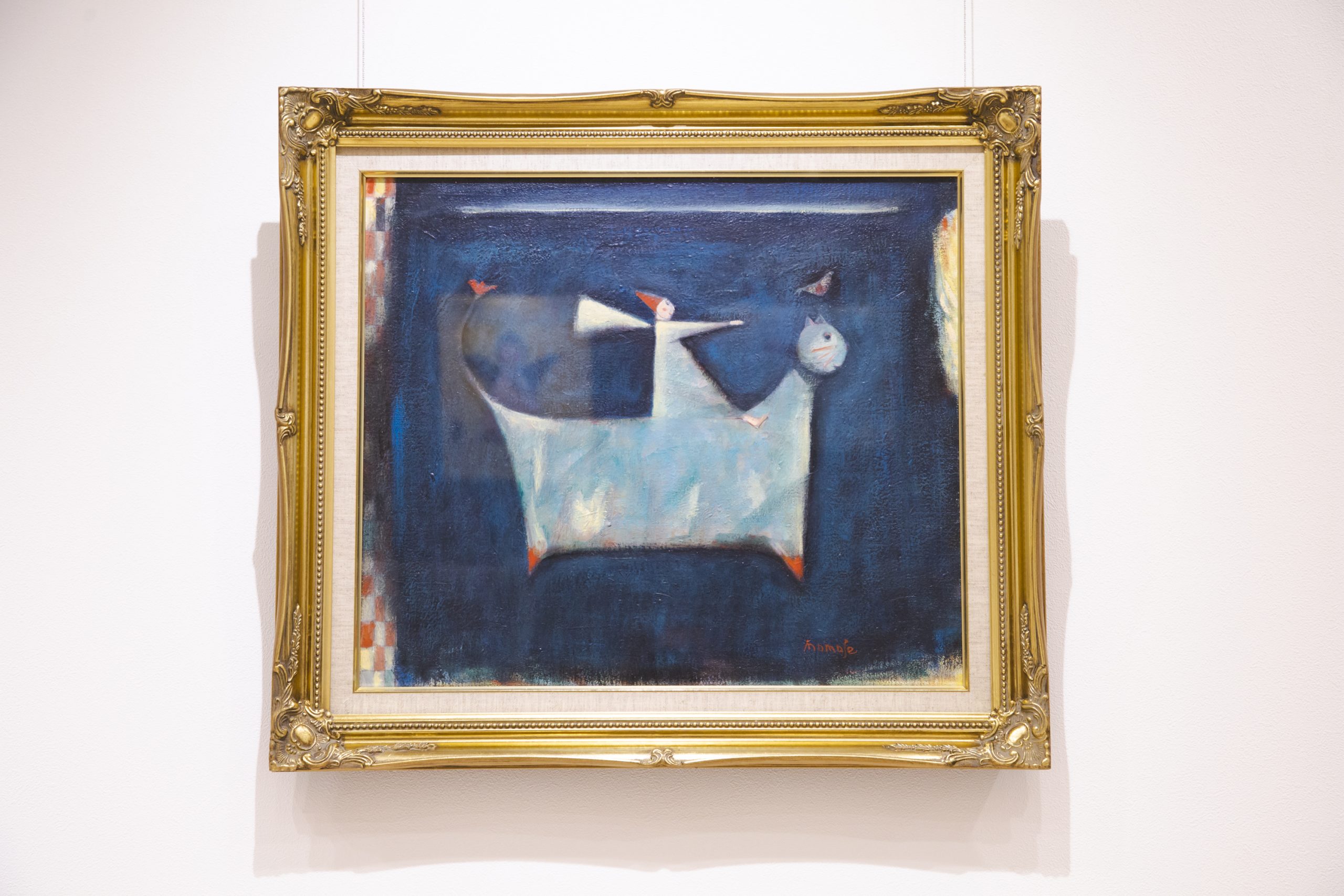 深みのある青系の背景に、かわいらしい猫が描かれた作品です。猫の背にはとんがり帽子の小人でしょうか。