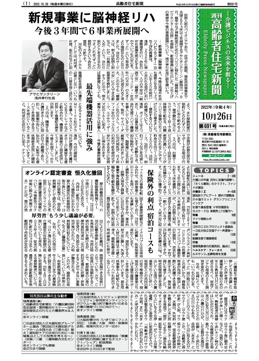 当リハビリセンターが高齢者住宅新聞(2022年10月26日付)に掲載されました。