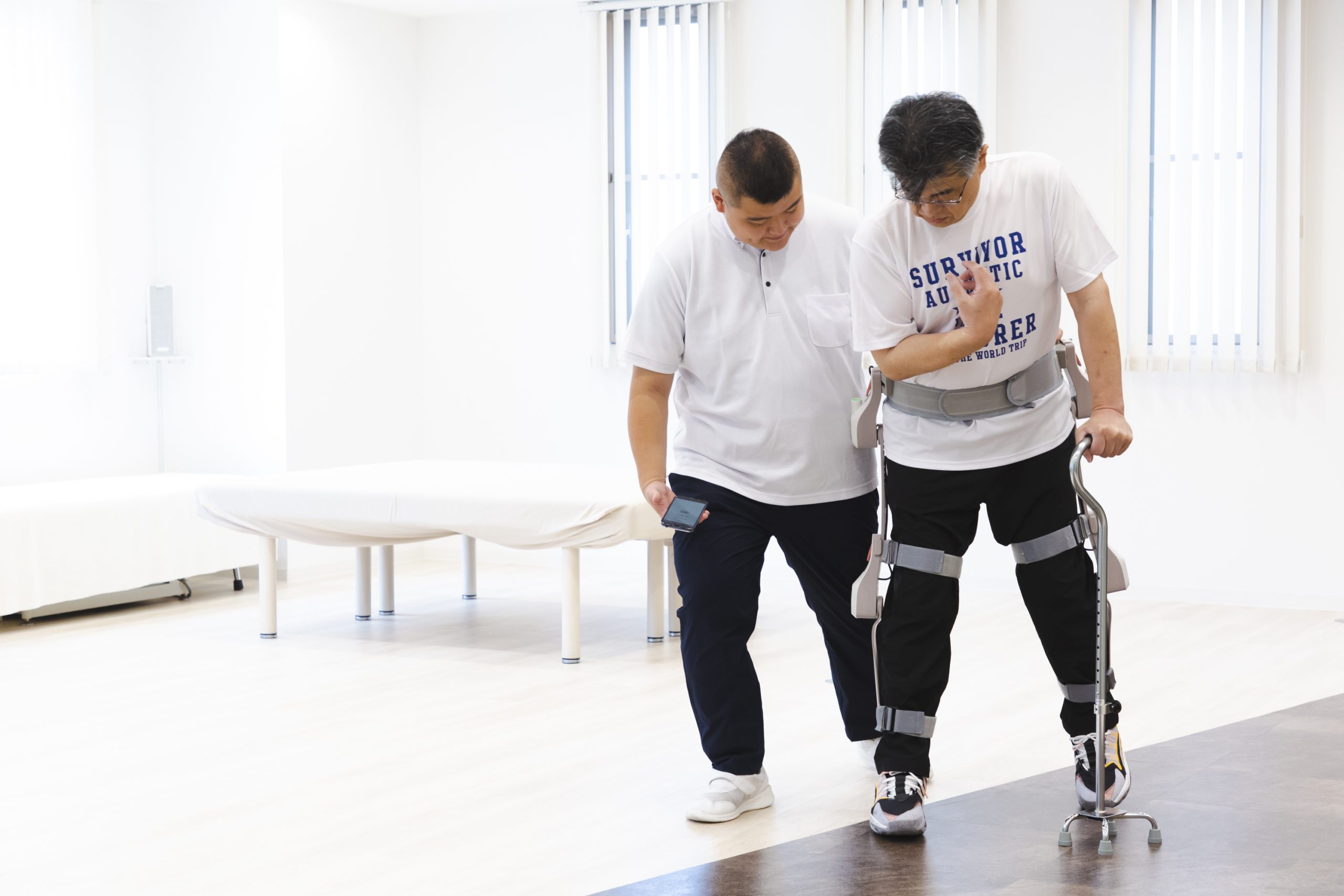 当施設では生活動作支援ロボットCurara®を導入しております。Curaraは、無理やり体を動かすロボットとは違い、使用している人のリズムに合わせて、下肢を誘導してくれるロボットです。その為、先ほどのつま先立ちを取り入れながら、Curaraが組み合わさることにより更なる改善が期待されます。また、これらを繰り返すことによって、お客様にとって、より一層効率の良い歩き方を覚えることができ、将来の怪我の防止や疲労感を軽減する事が可能となります。